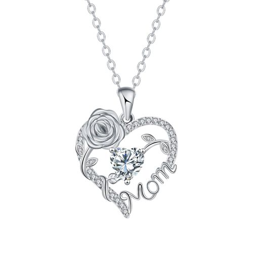 Silver Mom Necklace Heart and Rose Design with Zircon Stones Ideal Mothers Day Gift